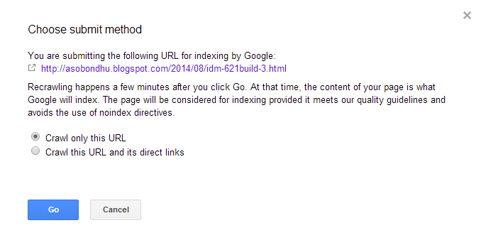 Step five:After clicking Submit to index button you can see a pop up button then click Crawl only this URL after click Go.