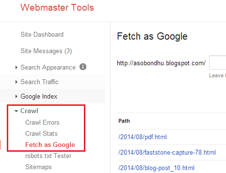 Step Two:Now open a new page then click left side Crawl Tab After u click on Fatch as google button.Like this image.